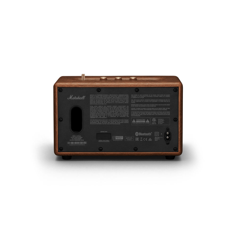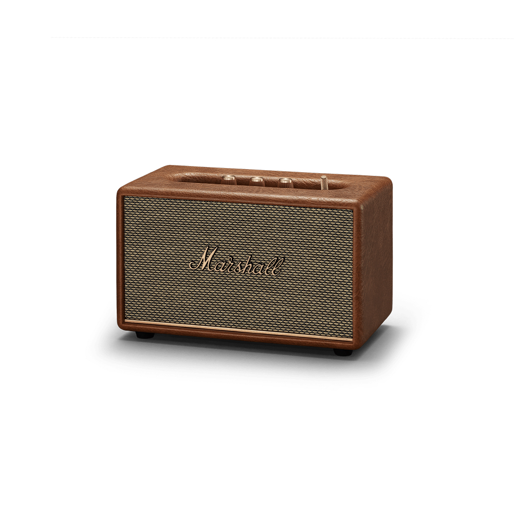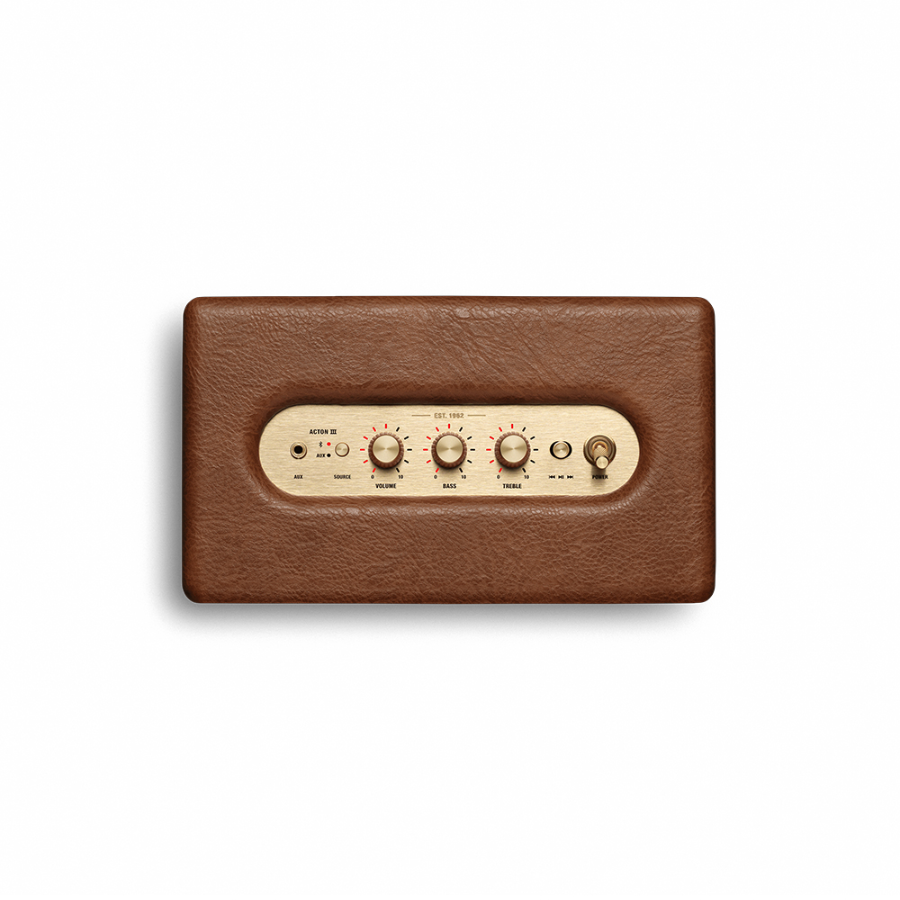 Acton IIIはMarshallの特徴的なロックンロールホームスピーカーのコンセプトを踏襲しつつ、ロゴプレート、真鍮のコントロールノブなどブランドアイデンティティを洗練されたデザインで表現しています。スピーカーの前面を飾る真鍮のパネルはより細く、流線型になり、フレットは全体的な仕上げに合わせてカラーコーディネートされています。マルチディレクショナルコントロールノブとクラシックなパワースイッチはスピーカー本体を演出し、マーシャルアンプのレガシーを彷彿させます。