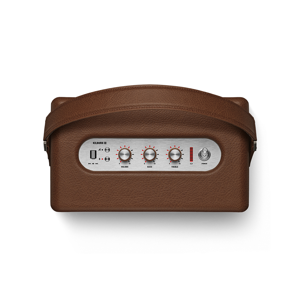 またデザイン面においても細部までの工夫が施されており、自社のアンプやロックンロールの歴史にインスパイアされたクラシックな外観を踏襲しています。ベルベット縁のストラップやロータリーノブなどは、どのような場面にもきれいにフィットする定番なデザインとなっています。コードや電源を気にすることなく持ち運びできるほか、IP54の防水防塵対応により屋内でも屋外でも、「Kilburn III」があればお気に入りのプレイリストをどこでも再生できます。